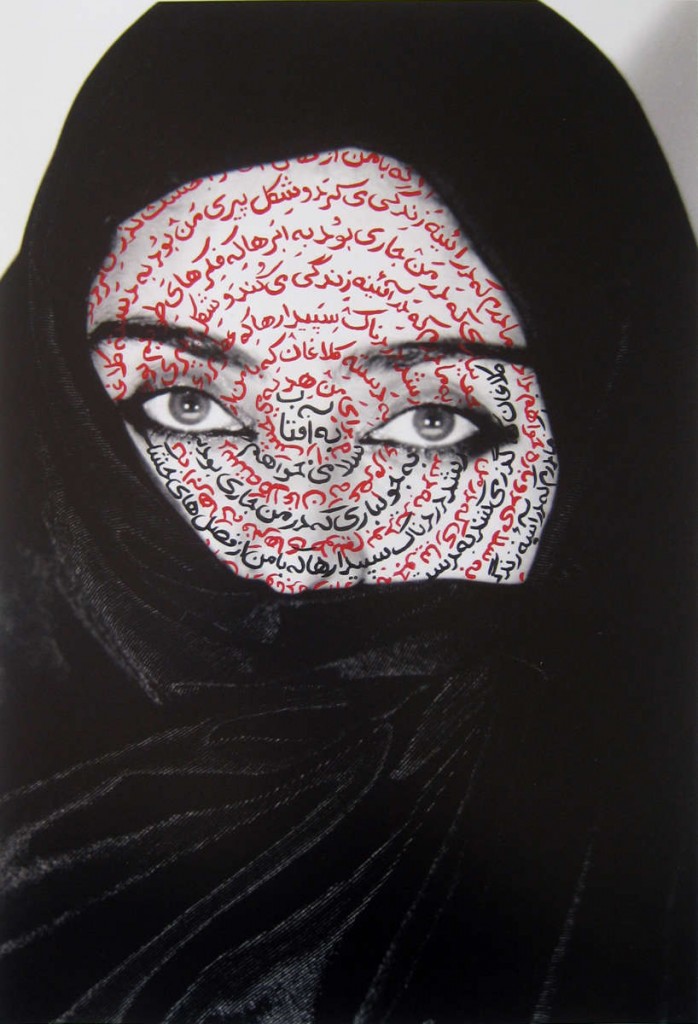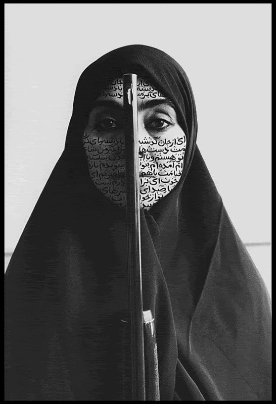 در عکس زیر روی صورت زن محجّبه به شکل دایرهوار شعر «به آفتاب سلامی دوباره خواهـم دادِ» فروغ فرّخزاد نوشته شده است: «به مادرم که در آیینه زندگی میکرد و شکل پیری من بود …»
